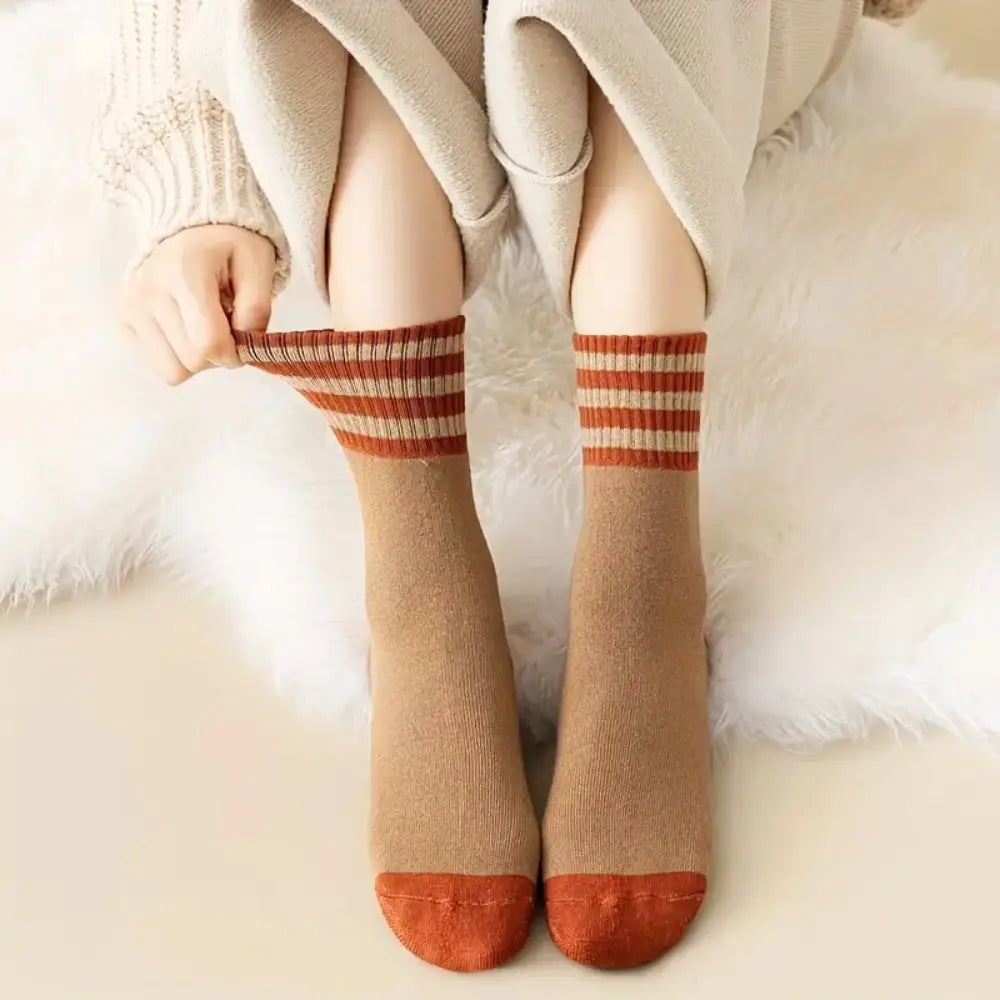 Each pair features rich, natural colors inspired by autumn days and cozy weekends. The subtle striped cuff adds a retro touch while keeping your outfit stylish and effortless. Designed to blend easily with any wardrobe, they bring a calm, warm charm to your look.